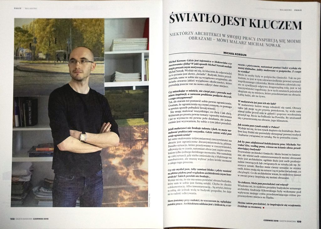 Te właśnie przestrzenie przywraca nam w swoich obrazach Michał Nowak. Od paru lat są one jednym z zasadniczych motywów jego malarstwa. Autorowi nie chodzi jednak o sportretowanie zaułków współczesnych miast. W jego pracach nie znajdujemy sentymentalnych widoków czy dramatycznych ujęć odwołujących się do estetycznej wrażliwości odbiorcy. Treść obrazów oscyluje najczęściej wokół kilku zagadnień, przede wszystkim skupiając się na dwóch obszarach: malarskiego rozwiązania płaszczyzny obrazu oraz dostrzeżeniu i wskazaniu niespójności rzeczywistości, w której żyjemy, a którą często po prostu ignorujemy. Często wirtuozerskie rozwiązania kompozycyjne, zdecydowane i w pełni świadome użycie koloru to z pewnością wyraziste cechy formalne malarstwa Michała Nowaka. Prócz tych estetycznych wartości odbiorcy znaleźć mogą tu znacznie więcej. W zunifikowanych przestrzeniach industrialnych, pozbawionych jednostkowej identyfikacji pojawiają się postaci, dzięki którym całość nabiera kategorycznie odmiennego znaczenia. W stabilną strukturę wkrada się ruch, w otwartą przestrzeń – wyraźnie określony kształt, nakazując widzowi określenie jego miejsca w spotkaniu z opisywaną przez Artystę rzeczywistością. Do charakterystycznych zjawisk współczesności należy mieszanie kategorii przestrzeni i czasu. „Za 10 minut” brzmi dla nas mniej-więcej tak samo jak „za 5 kilometrów”. „Tam” oznaczać może niemal to samo, co „kiedyś”, „tu” to niemal synonim określenia „teraz”. Oswajamy na własny użytek wymykającą się nam przestrzeń i uciekający czas. Próbujemy okiełznać własne „bycie” w czasie i przestrzeni by móc znaleźć odpowiedź na pytanie o to, kim właściwie jesteśmy. Ten proces budowania przestrzeni własnej świadomości i tożsamości to jeden z wątków bliskich poszukiwaniom Autora. Bo jedynie wiedząc coś o sobie możemy odnaleźć cokolwiek w świecie – i w obrazie świata. Miejsca z obrazów Michała Nowaka są miejscami w nas samych, często właśnie tymi, których sami moglibyśmy nie zauważyć. Odbija się w nich nie tylko świadomość twórcy, ale także świadomość widza, który może odkryć dla siebie ogromną, czystą i frapującą przestrzeń nowego doświadczenia..